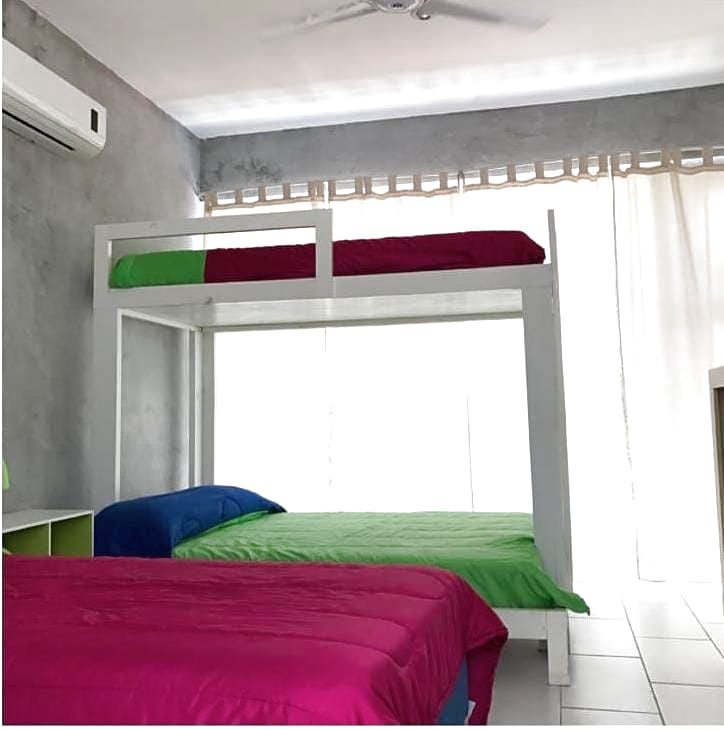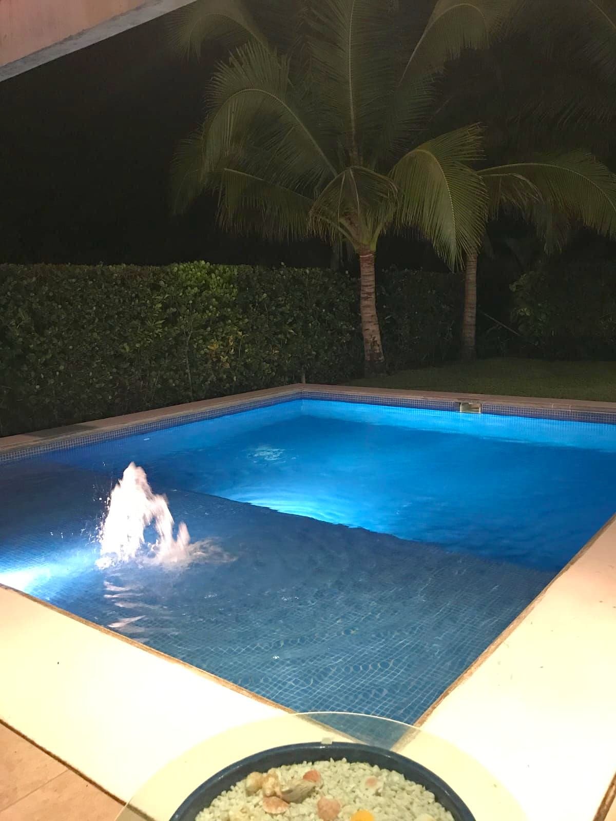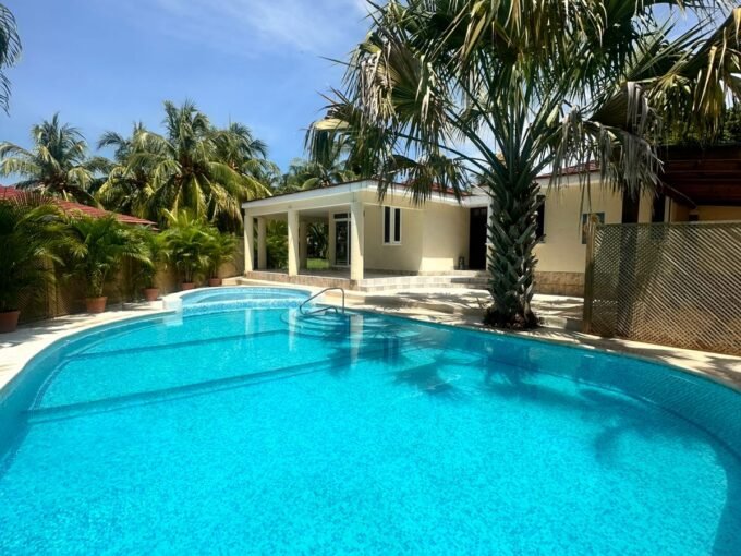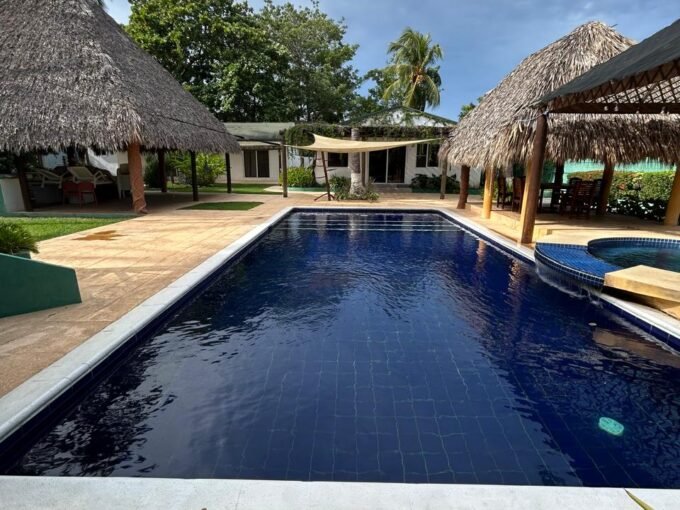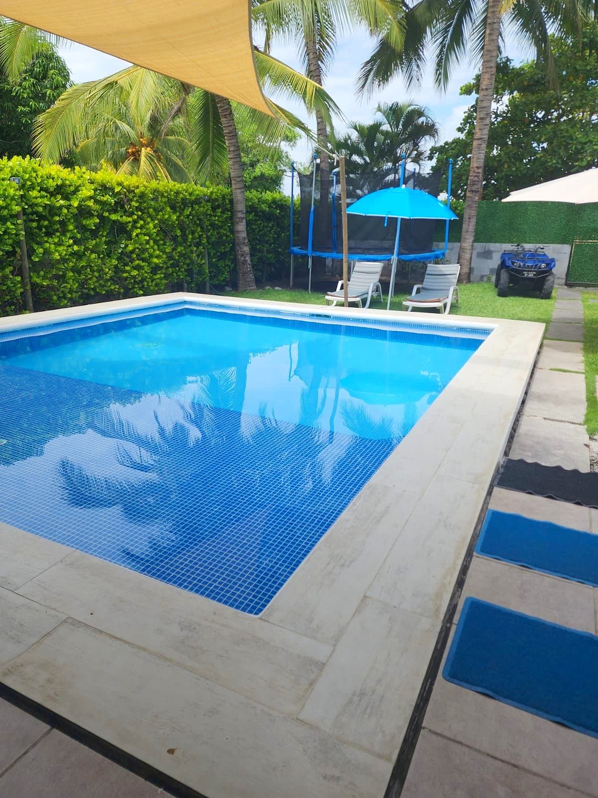 Disfruta su piscina con lagartera y área de sol, pérgola con mesa y sillas, y un amplio jardín con churrasquera, regadera y baño externo. Las 3 habitaciones cuentan con baño privado y aire acondicionado, y hay espacio para 3 vehículos.