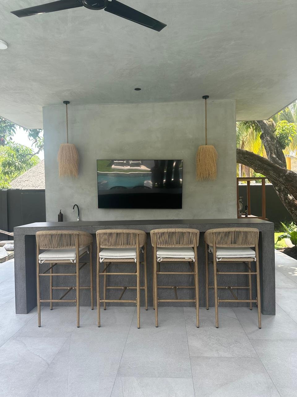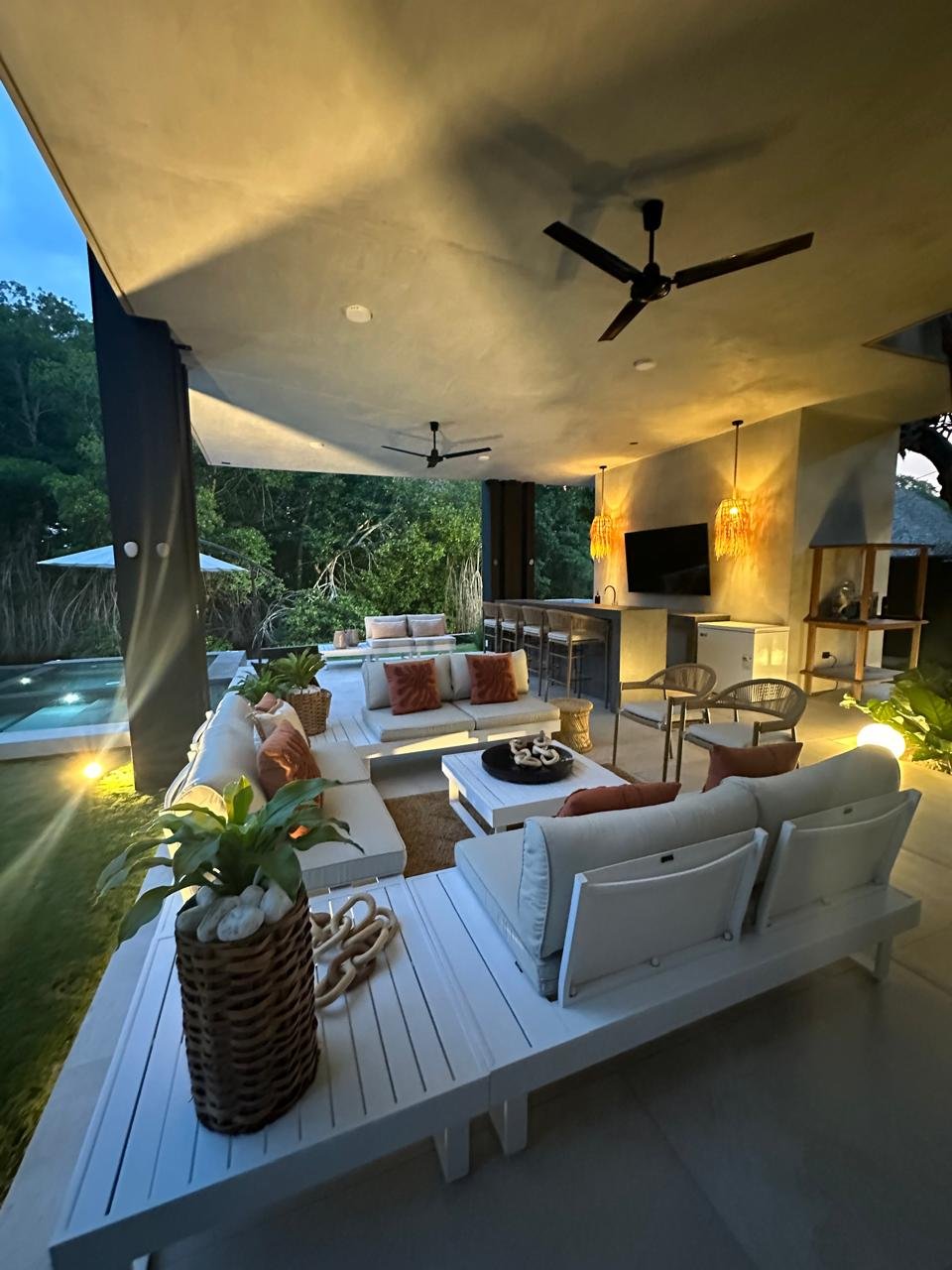 – Pérgola integrada con TV de gran formato, bar, sala, comedor y baño exterior