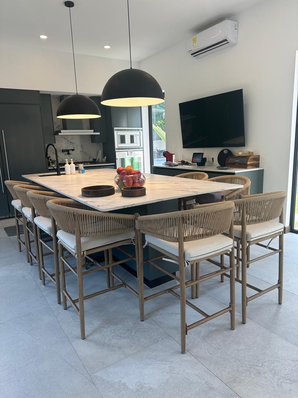 – Cocina doble con refrigerador, cooktop, campana, dishwasher, microondas, horno y gaveta caliente